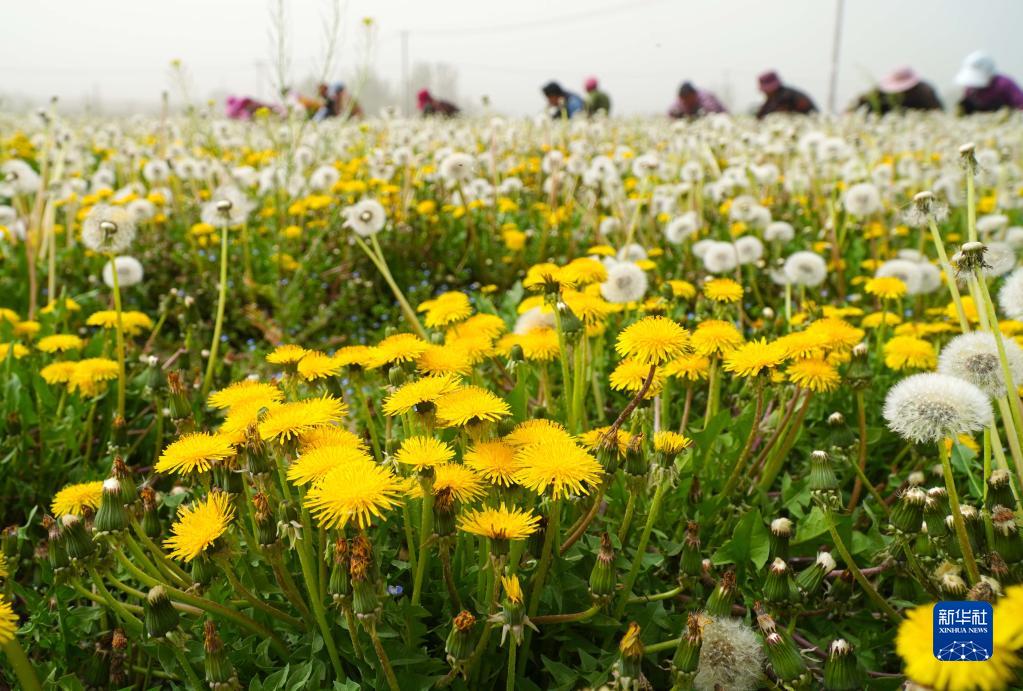 4月11日,在山東省單縣龍王廟鎮,村民在蒲公英種植田收割蒲公英。