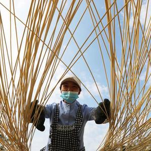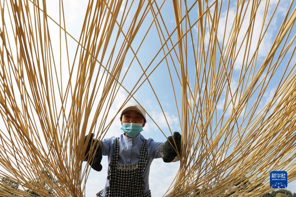 4月11日,在赤水市復興鎮太和村,工人分選竹絲。