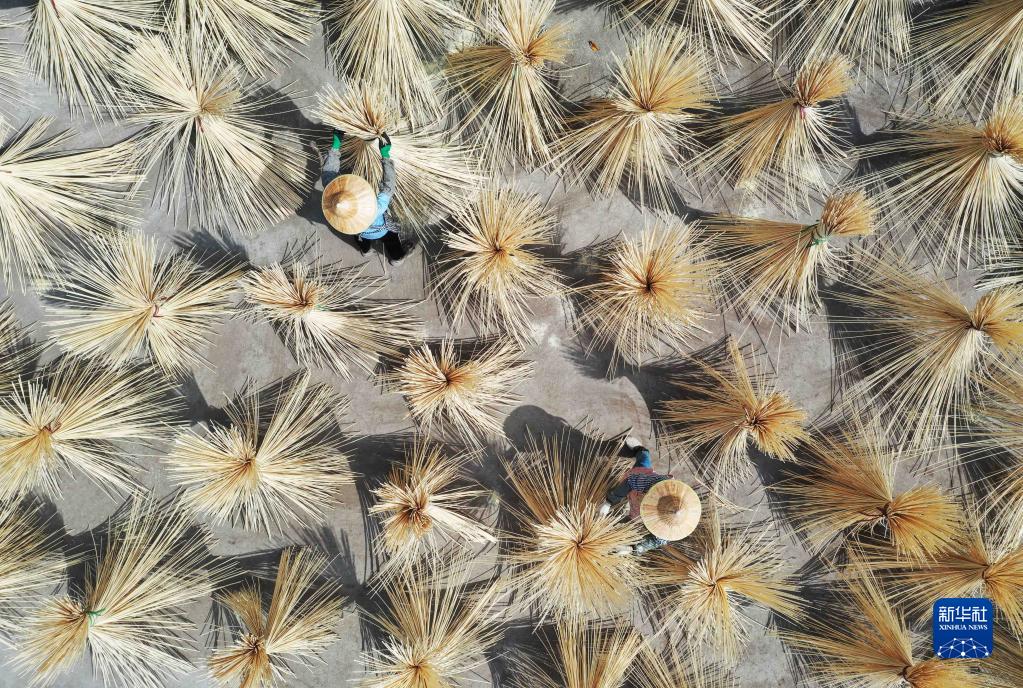4月11日,在赤水市復興鎮太和村,工人晾曬竹絲(無人機照片)。