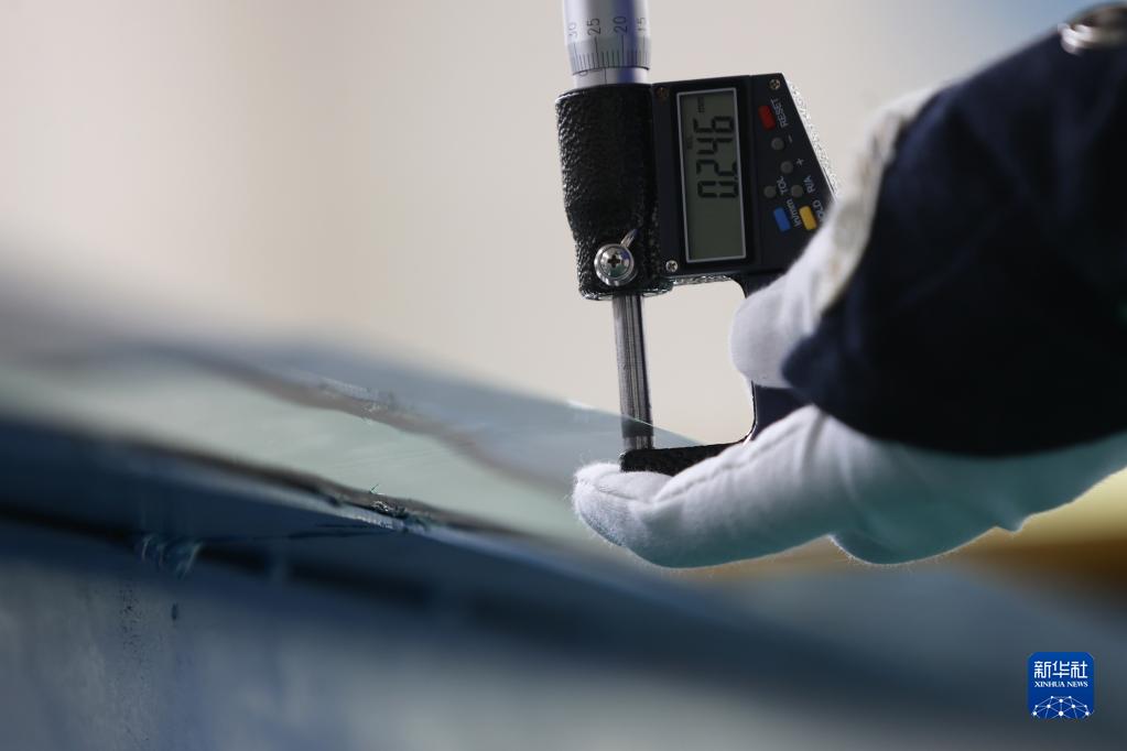 4月11日,在永清縣一家超薄玻璃生產企業,技術人員在檢查玻璃質量。