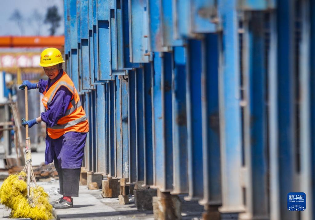 梁開高速梁場制梁區保潔員沈亞珍在工地打掃衛生(2023年3月20日攝)。