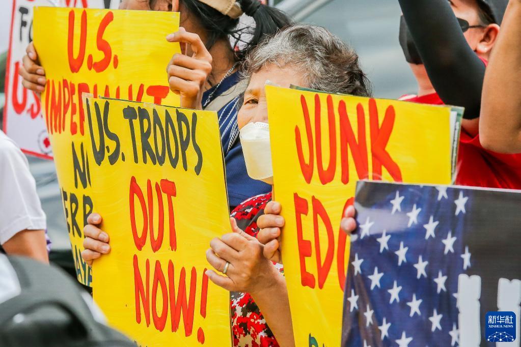 4月11日,在菲律賓首都大馬尼拉地區奎松城,民眾參加集會活動,抗議菲律賓和美國軍方舉行聯合軍事演習。