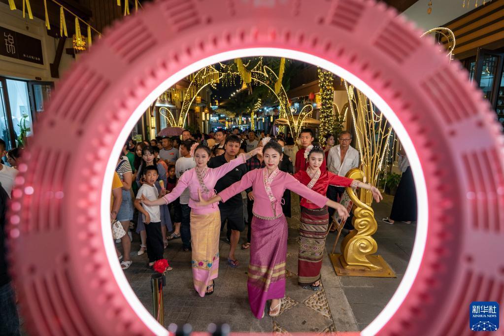 華燈初上,位于云南省德宏傣族景頗族自治州芒市的傣族古鎮逐漸熱鬧起來。作為2022年國家文化和旅游部確定的第二批國家級夜間文化和旅游消費集聚區之一,這里極具特色的少數民族建筑、服飾、舞蹈、美食吸引著人們流連忘返。