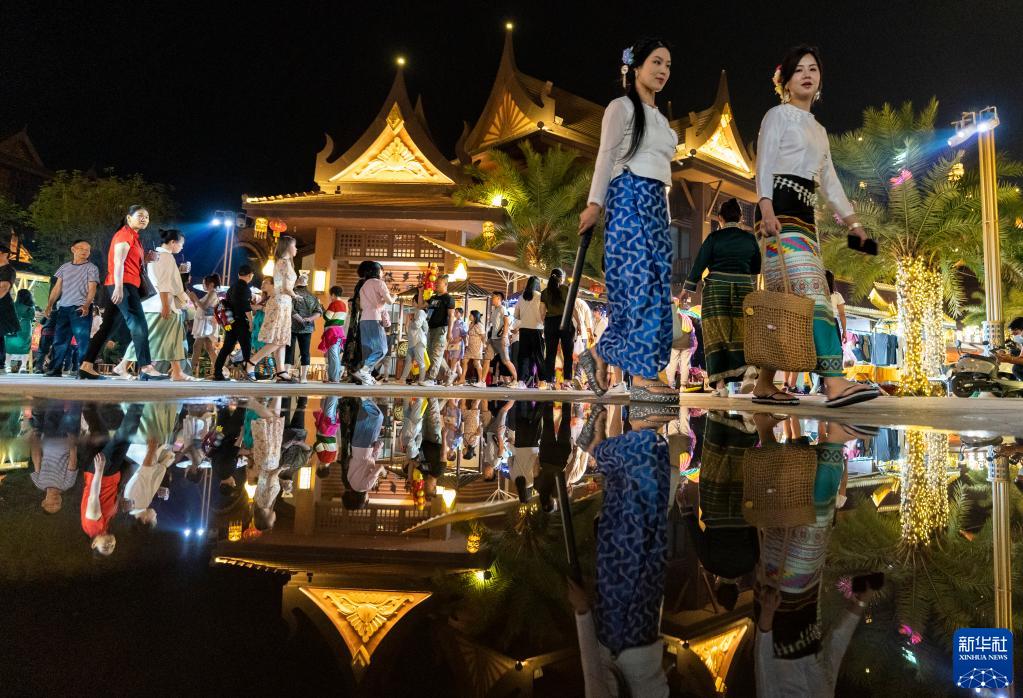 華燈初上,位于云南省德宏傣族景頗族自治州芒市的傣族古鎮逐漸熱鬧起來。作為2022年國家文化和旅游部確定的第二批國家級夜間文化和旅游消費集聚區之一,這里極具特色的少數民族建筑、服飾、舞蹈、美食吸引著人們流連忘返。