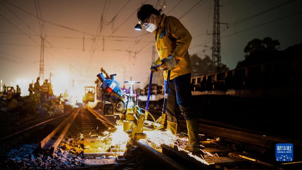 4月12日,在廣西欽州港站,工人在打磨新鐵軌。