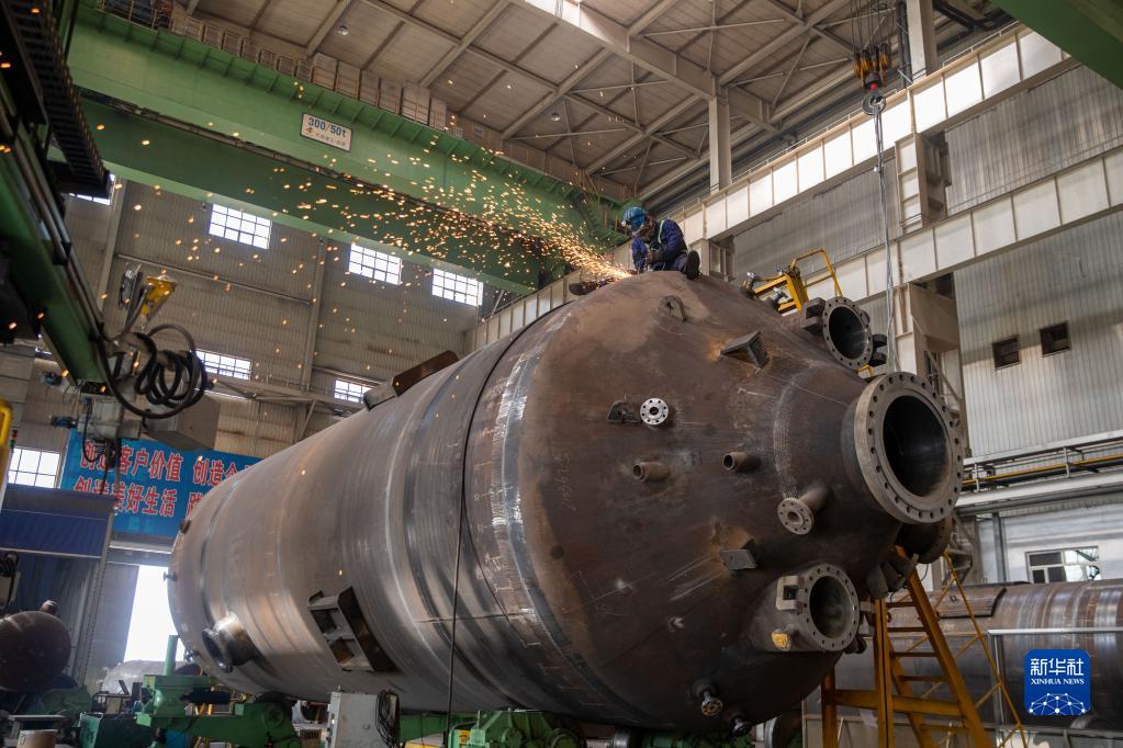 4月12日,工人在哈電集團哈爾濱鍋爐廠有限責任公司生產車間內作業。