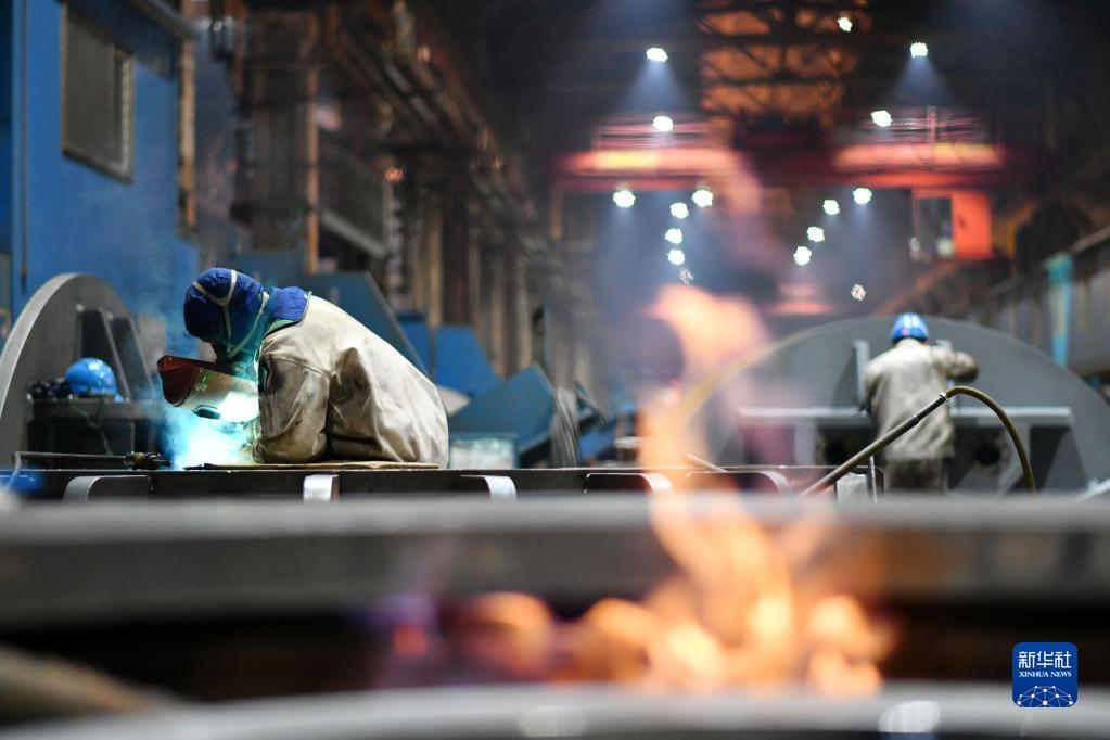 4月11日,工人在哈電集團哈爾濱電機廠有限責任公司車間內生產作業。
