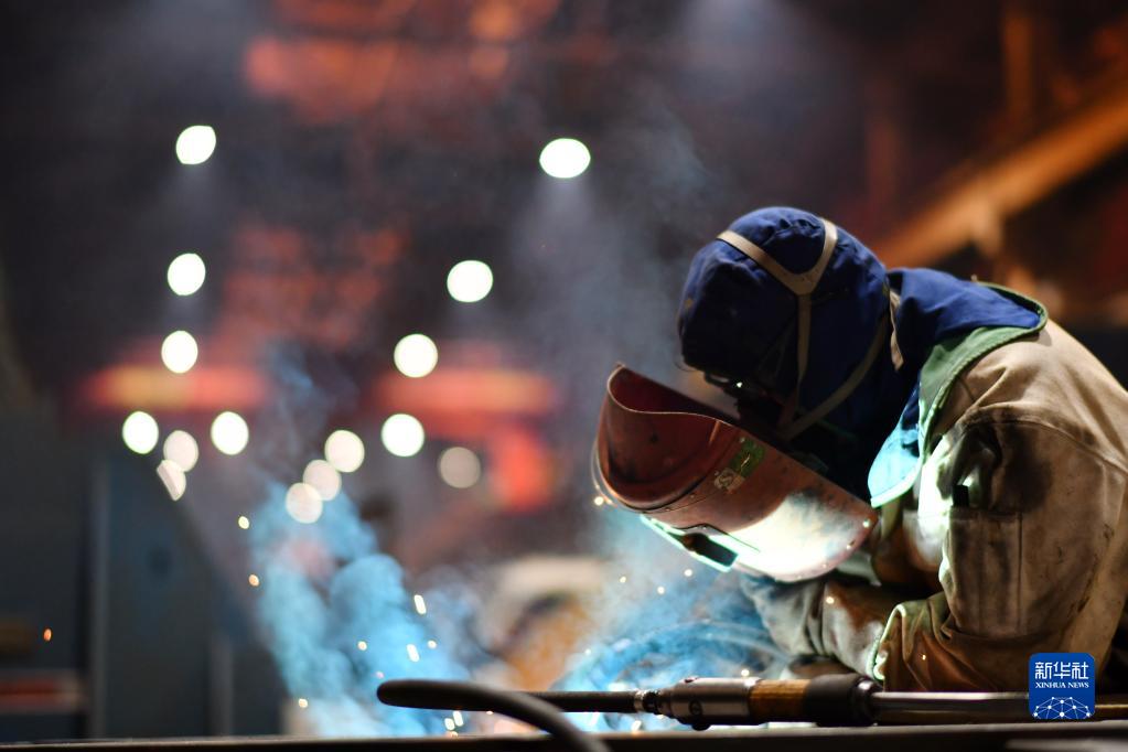 4月11日,工人在哈電集團哈爾濱電機廠有限責任公司車間內生產作業。
