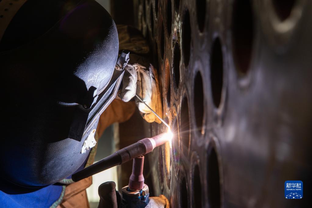 4月12日,工人在哈電集團哈爾濱鍋爐廠有限責任公司生產車間內作業。