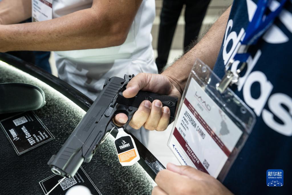 4月11日,在巴西里約熱內盧,參觀者在巴西防務展上體驗一款手槍。