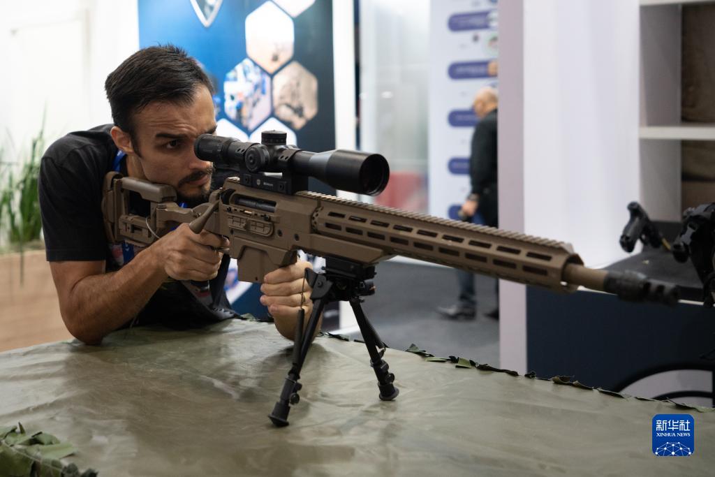 4月11日,在巴西里約熱內盧,一名男子在巴西防務展上體驗一款步槍。