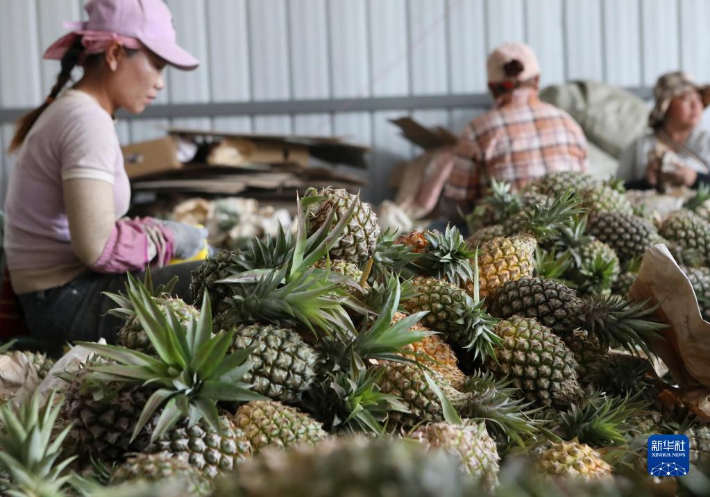 近日,云南省西雙版納傣族自治州景洪市鳳梨種植基地的鳳梨成熟,工人忙著采摘、分揀、裝箱銷往市場。近年來,景洪市因地制宜引進鳳梨種植企業,豐富熱帶水果品種,帶動當地農民增收。
