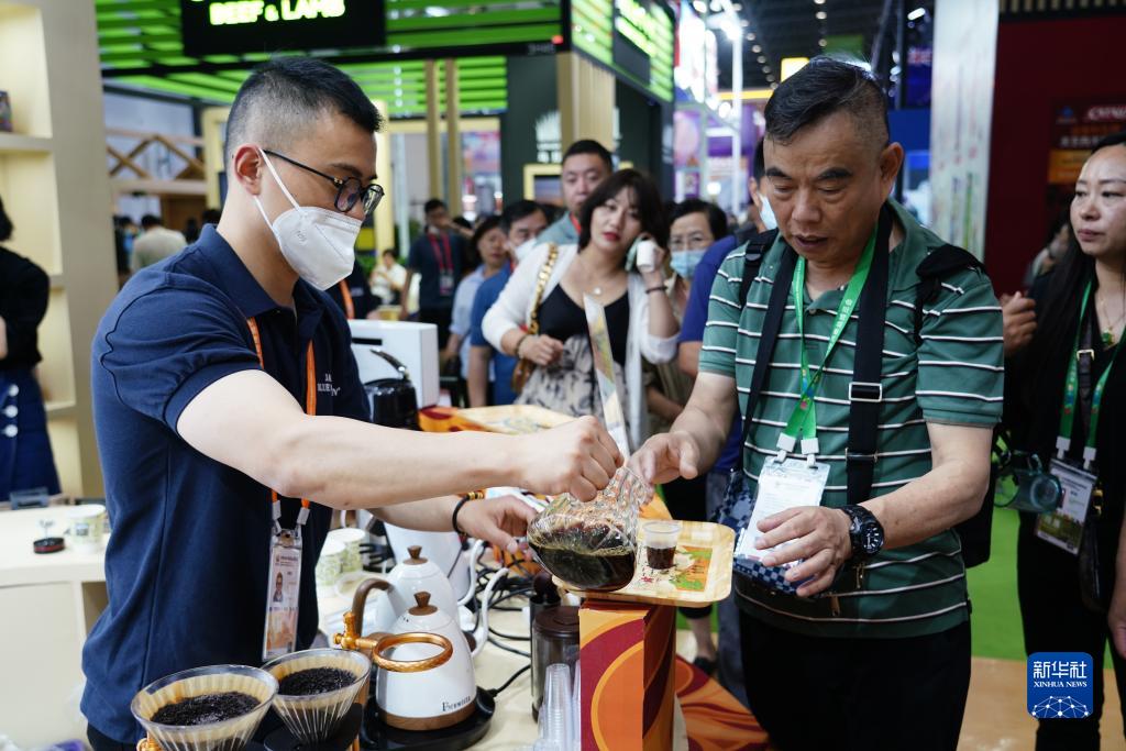 4月12日,參觀者在消博會現場品嘗牙買加藍山咖啡。