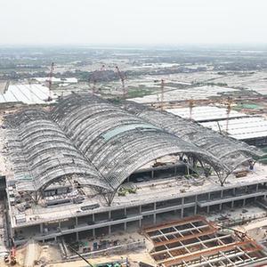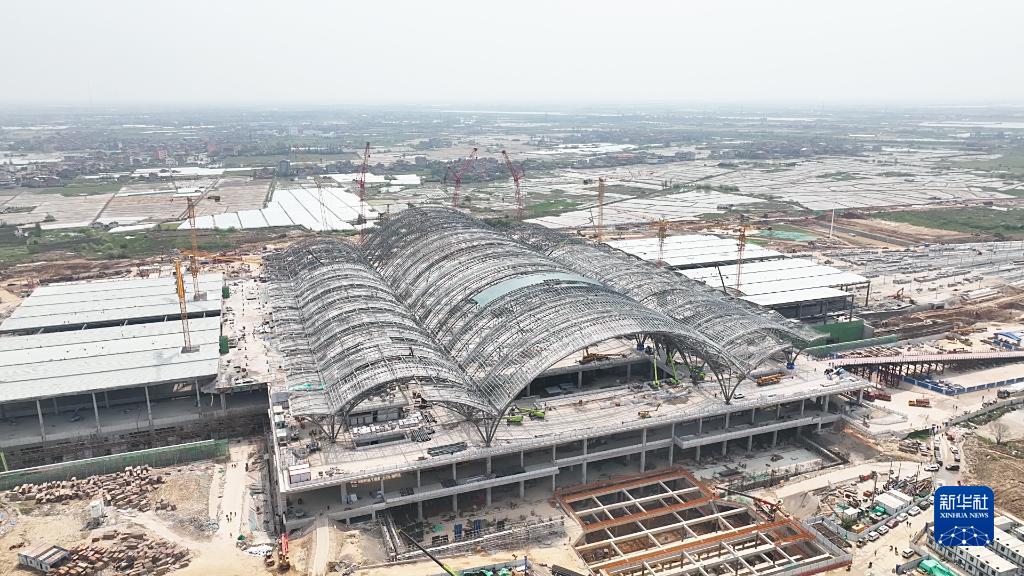 4月12日拍攝的在建的南昌東站站房工程外景(無人機照片)。