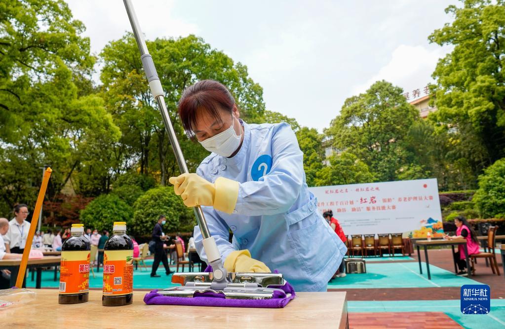 4月12日,一名參賽的養老護理員在進行養老環境保潔項目的技能比賽。