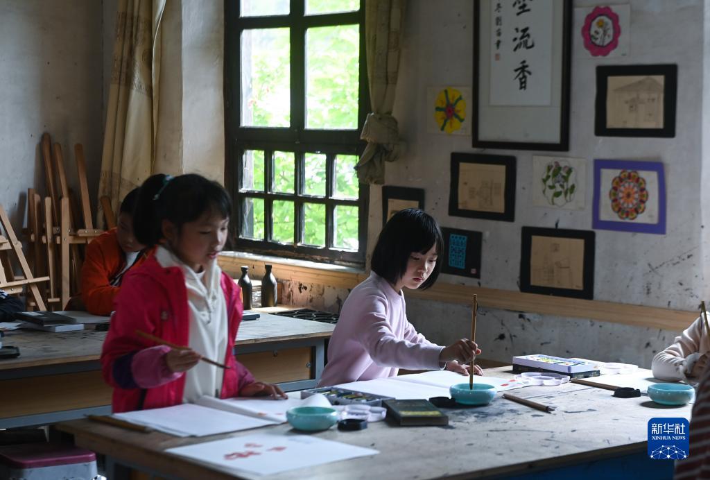 4月12日,諸暨市東白湖鎮斯民小學的學生在上國畫課。