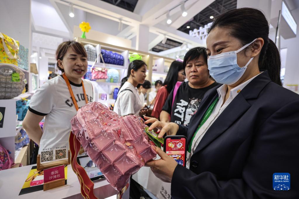 4月12日,消博會泰國館的參展商向觀眾介紹泰國沙灘包。