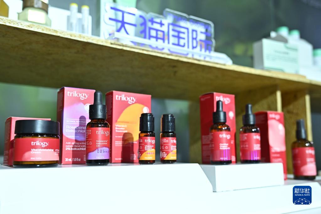 這是消博會天貓國際展臺擺放的新西蘭護膚品牌萃樂活的產品(4月12日攝)。