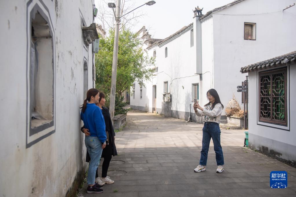 4月12日,游客在諸暨市暨南街道周村古村落內游玩拍照。暨南街道周村是歷史文化村落,擁有豐富的古建筑資源。