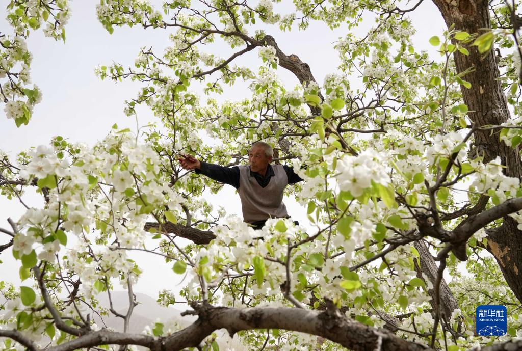 4月12日,河北省青龍滿族自治縣官場鄉山嶺高村的農民在管護旱作梯田間的安梨樹。