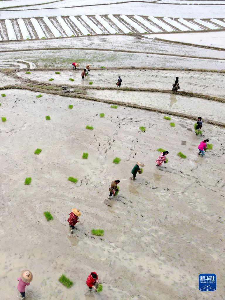 4月12日,農民在湖南省婁底市雙峰縣井字鎮花橋村的田間拋秧(無人機照片)。