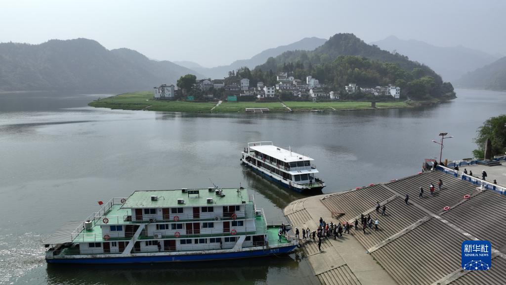 4月12日,在安徽省黃山市歙縣的新安江山水畫廊景區,游客在深渡鎮碼頭登船(無人機照片)。