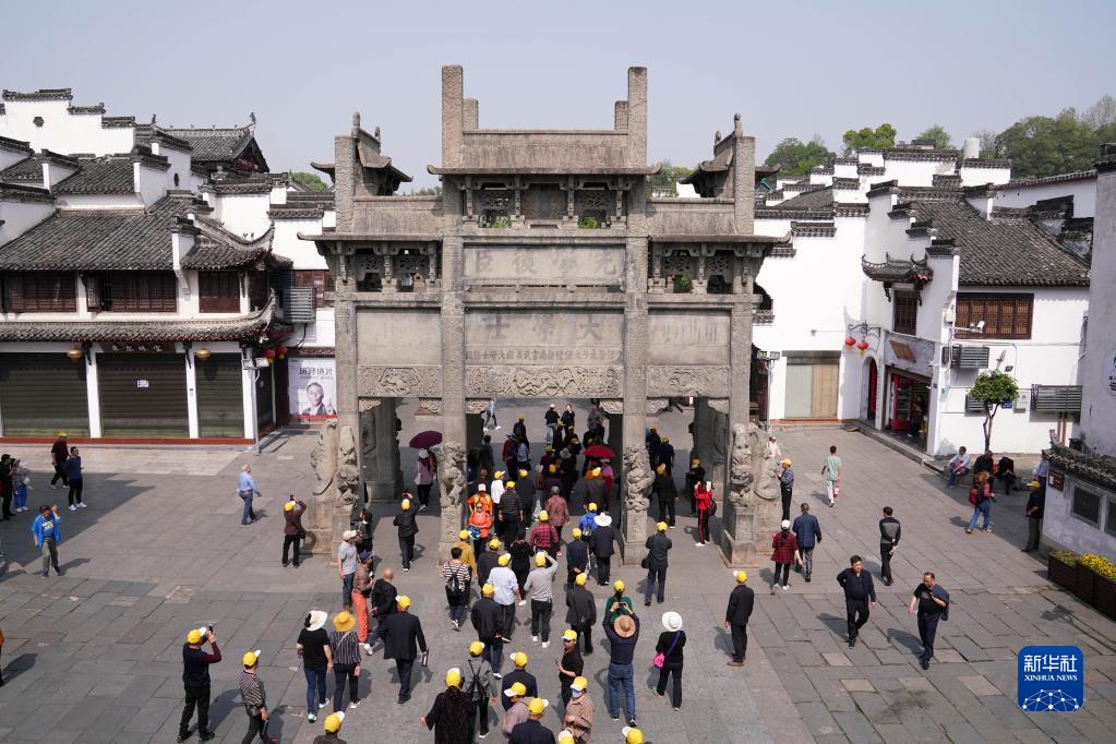 4月12日,在安徽省黃山市歙縣的徽州古城景區,游客參觀許國牌坊。