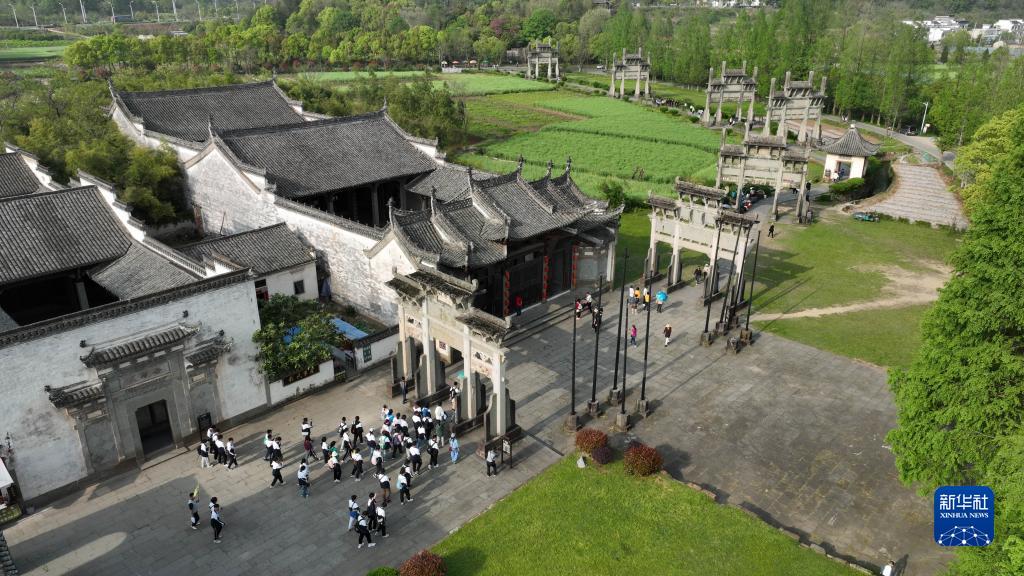 4月12日,游客在安徽省黃山市歙縣棠樾牌坊群景區參觀(無人機照片)。