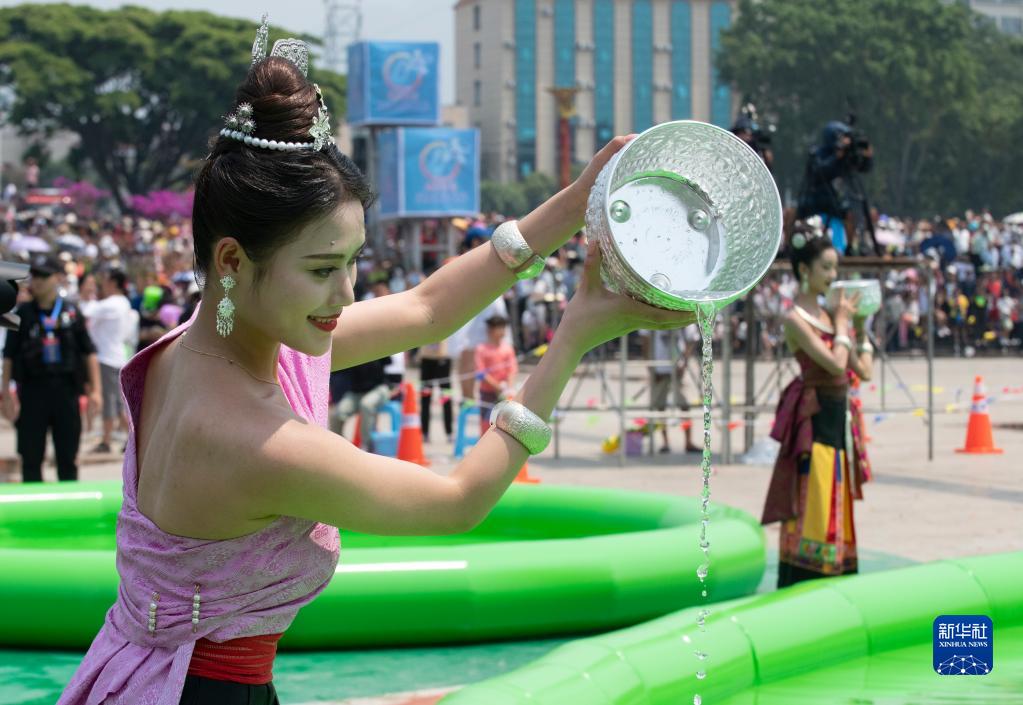 當日,云南省德宏傣族景頗族自治州芒市2023年潑水狂歡節開幕,人們相互潑灑代表幸福、吉祥的清水,表達著相互間的無限祝福。