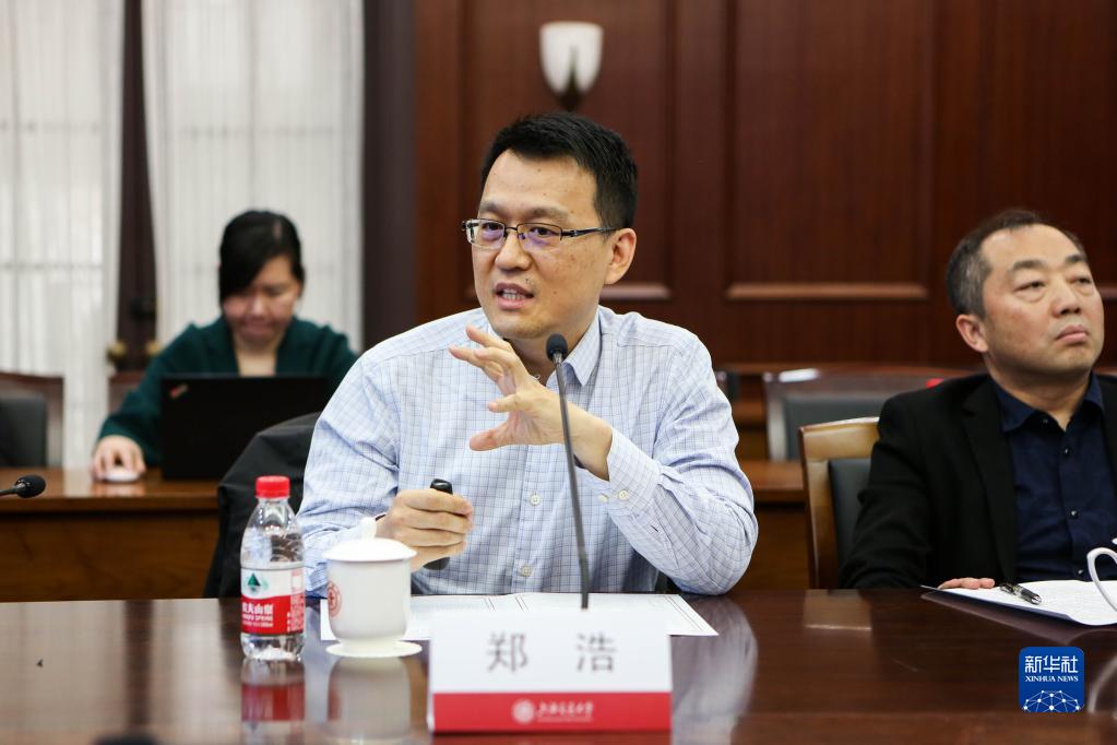 4月12日,上海交通大學物理與天文學院教授鄭浩(前排左一)介紹“實驗證實超導態‘分段費米面’”成果。