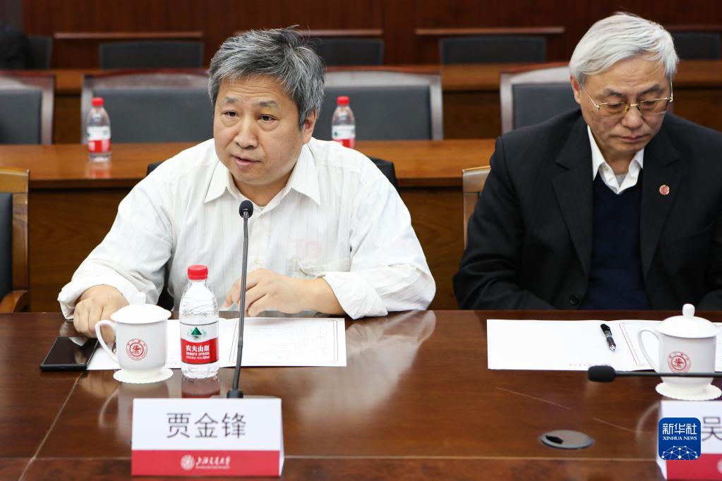 4月12日,中國科學院院士、上海交通大學物理與天文學院教授賈金鋒(左一)介紹“實驗證實超導態‘分段費米面’”成果整體情況。