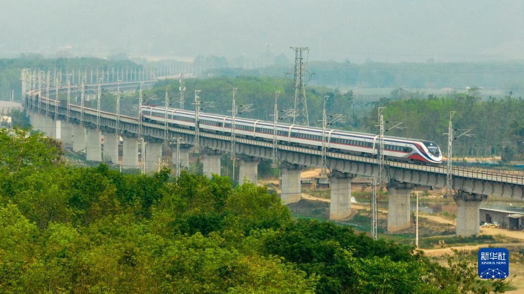 4月13日,從老撾萬象站駛出的D888次“瀾滄號”列車行駛在云南省西雙版納州境內的中老鐵路橄欖壩特大橋上。