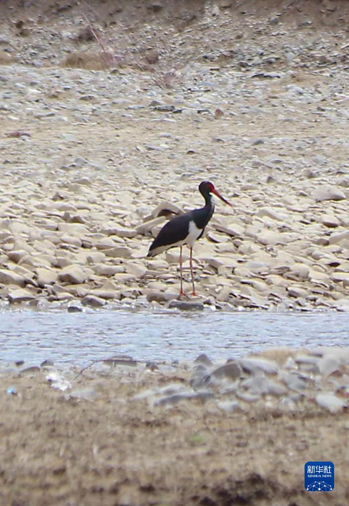 近日,在四川省色達縣康勒鄉發現國家一級保護動物黑鸛。這只黑鸛和鸕鶿、赤麻鴨等聚集在一起,時而在河灘踱步、時而展翅飛翔。