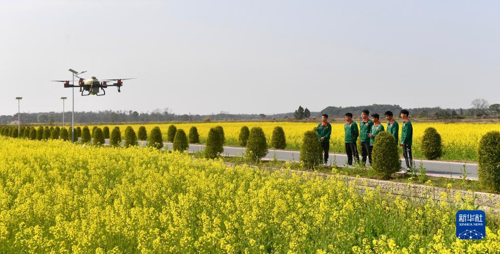 3月7日,黃從明的團隊操控無人機在油菜田噴施肥料。
