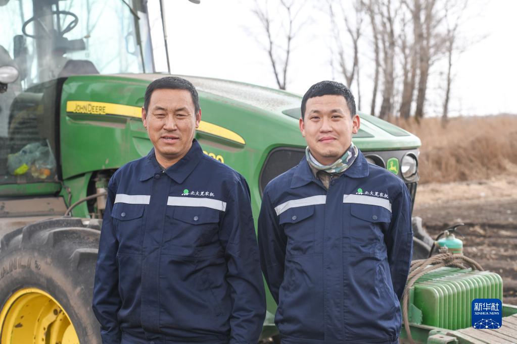 4月12日,在建設農場有限公司一處農田旁,許志國(左)與兒子許呈浩在大型拖拉機前合影。2019年,在外地工作的許呈浩回到建設農場有限公司第四管理區,協助父親許志國進行春耕與秋收等農業生產作業。
