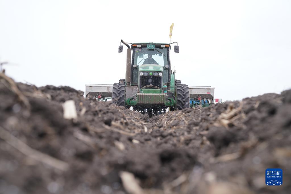 4月12日,在建設農場有限公司一處農田中,許志國駕駛大型拖拉機進行分層定量施肥作業。