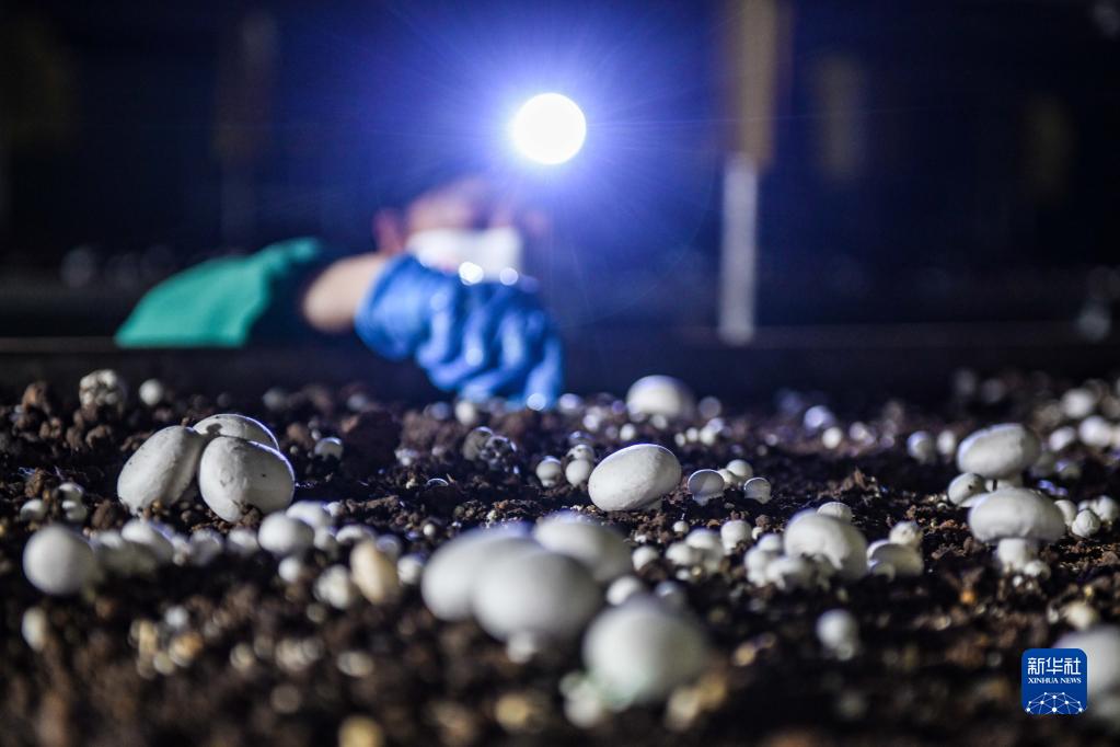 4月12日,在山東省泰安市永樂食用菌科技產業園出菇房內,員工采摘雙孢菇。