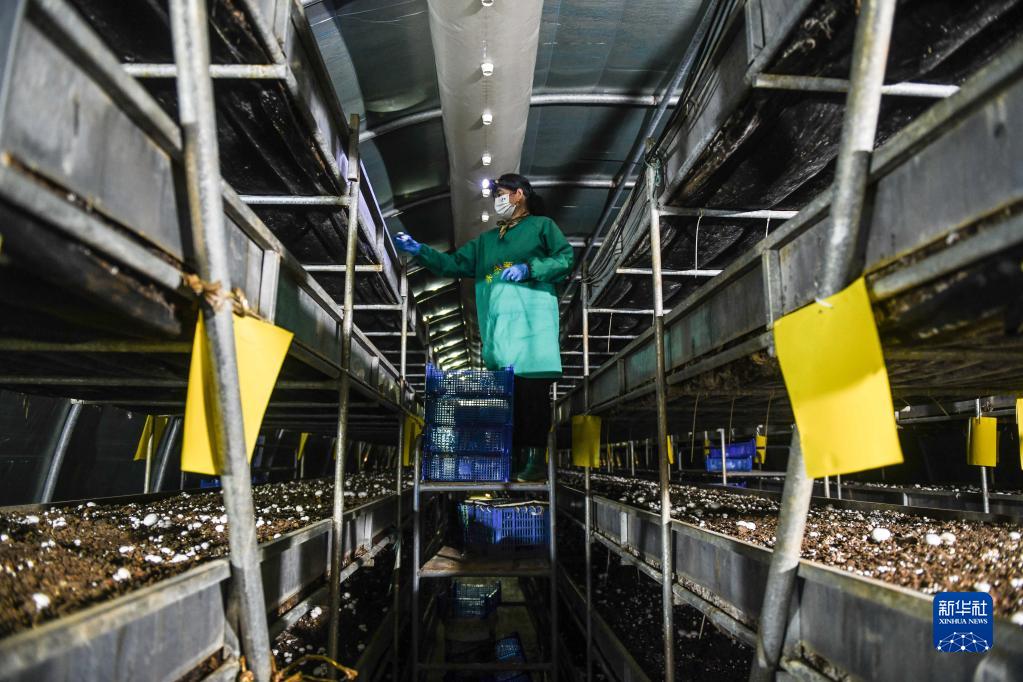 4月12日,在山東省泰安市永樂食用菌科技產業園出菇房內,員工采摘雙孢菇。