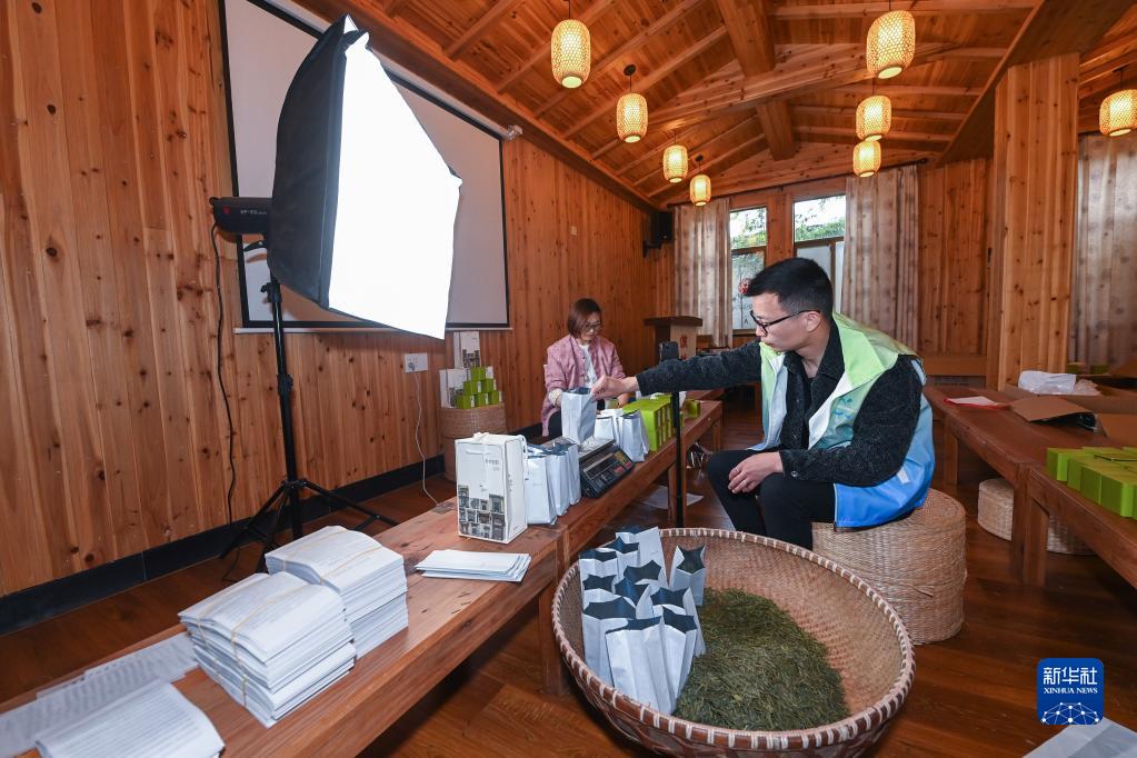 4月13日,在諸暨市東白湖鎮斯宅村“裕昌號恒諾甄選共富工坊”內,志愿者(右)對斯宅石筧茶進行裝袋稱重。