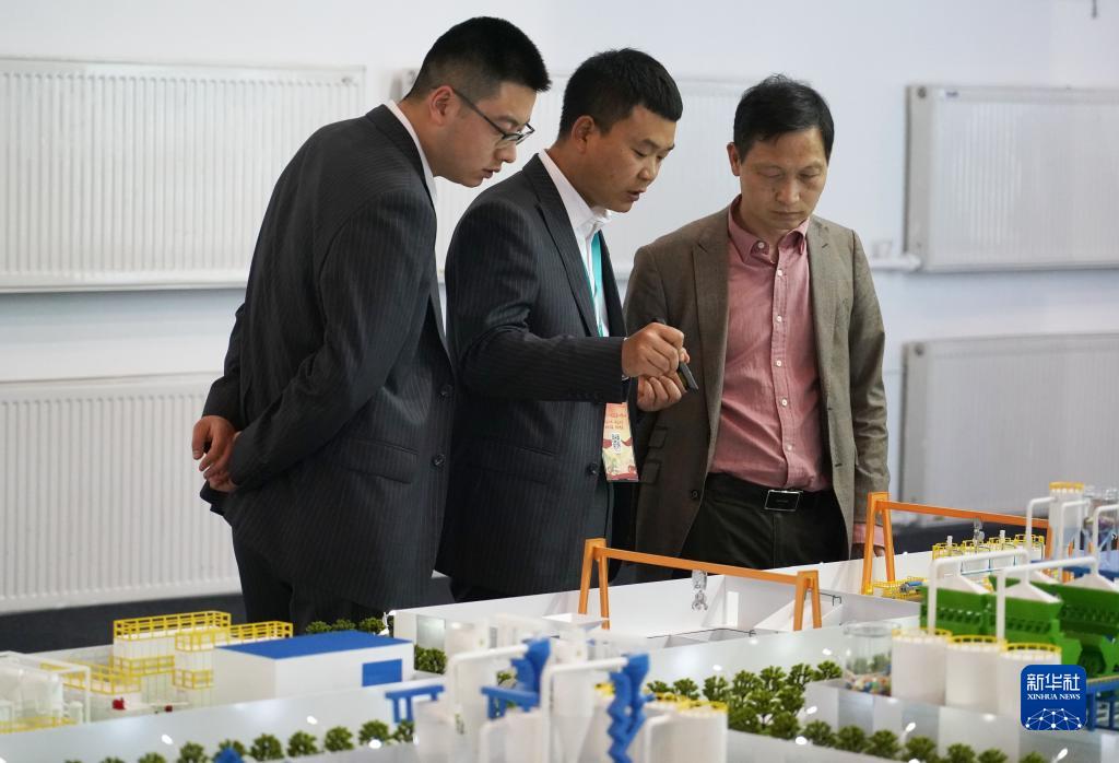 4月13日,在第十一屆中國“城市礦產”博覽會現場,一家企業的工作人員(中)與觀眾交流。