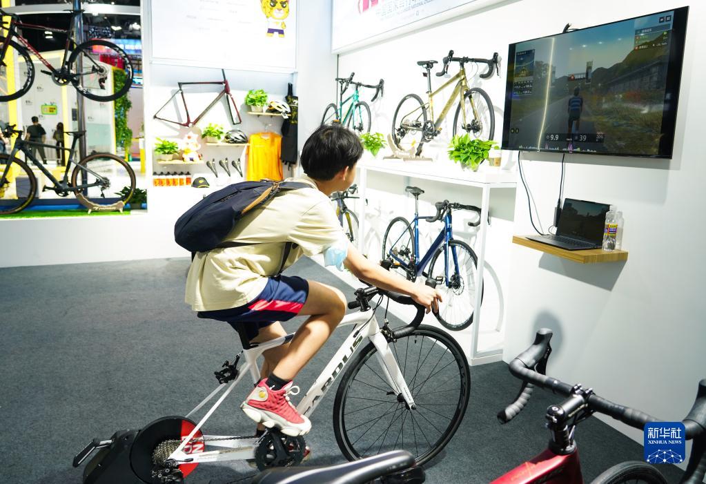 4月13日,參觀者在體驗國產智能功率騎行臺。