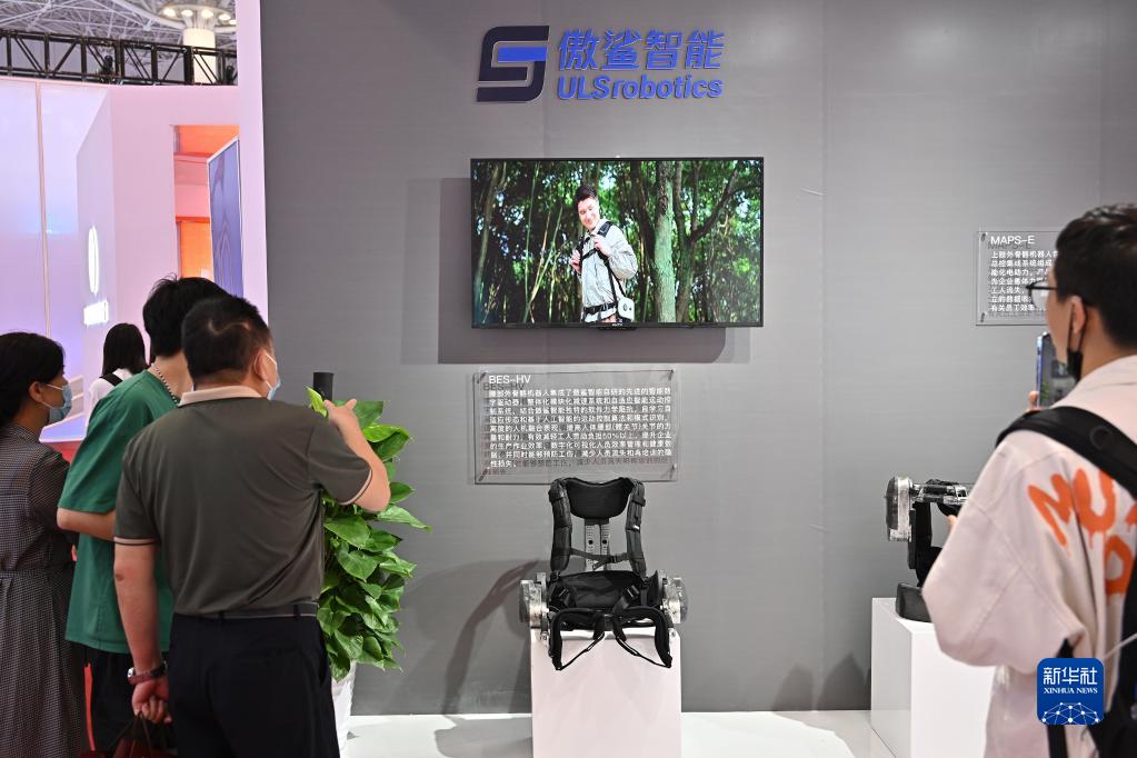 4月13日,參觀者在上海展臺了解一款腰部外骨骼機器人產品。
