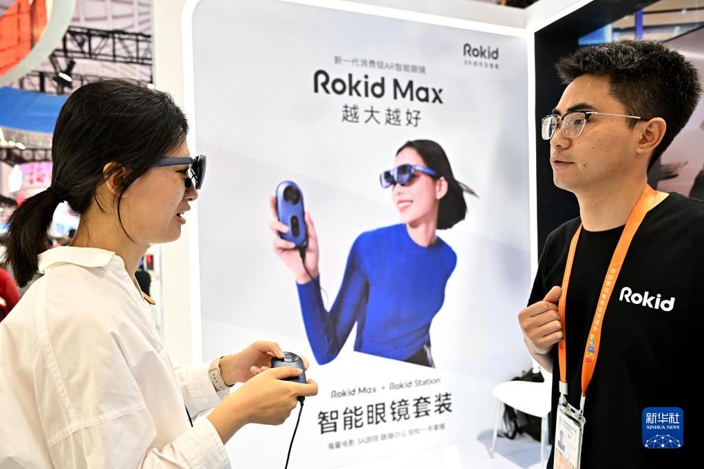 4月13日,一名參觀者在浙江展臺體驗一款智能眼鏡。