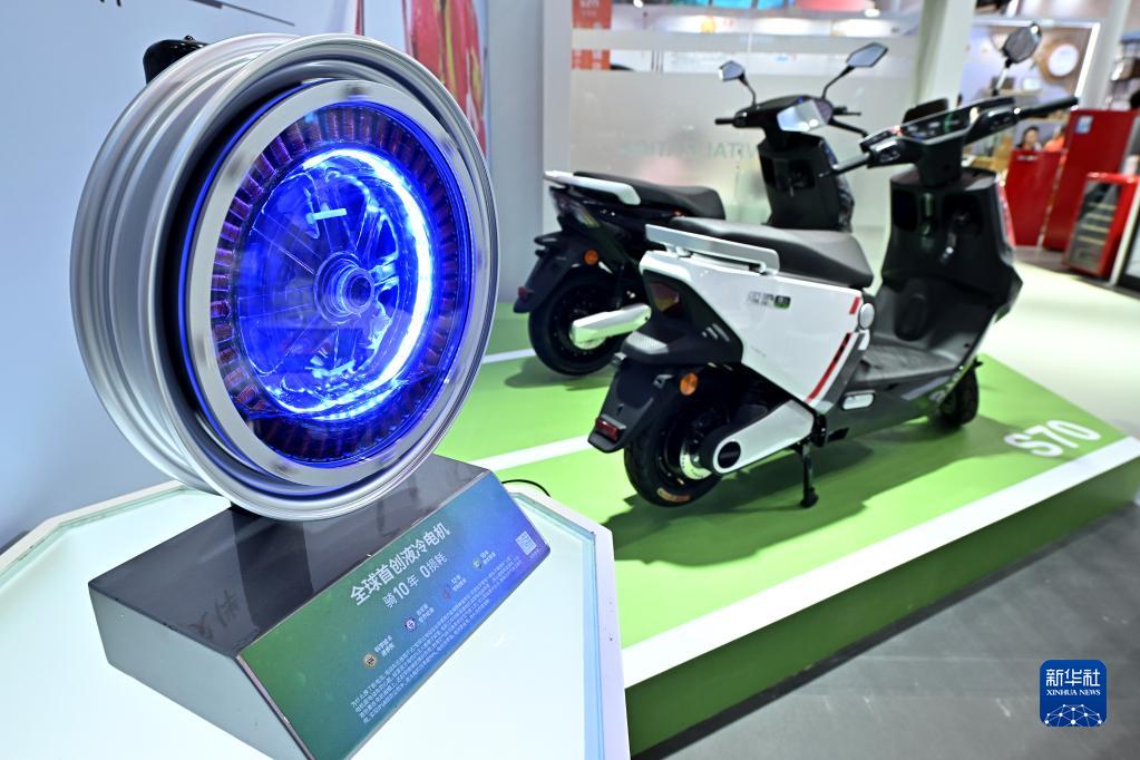 這是浙江展臺展示的綠源電動車液冷機芯,它可以提高電機效率、增加電動車續航(4月13日攝)。