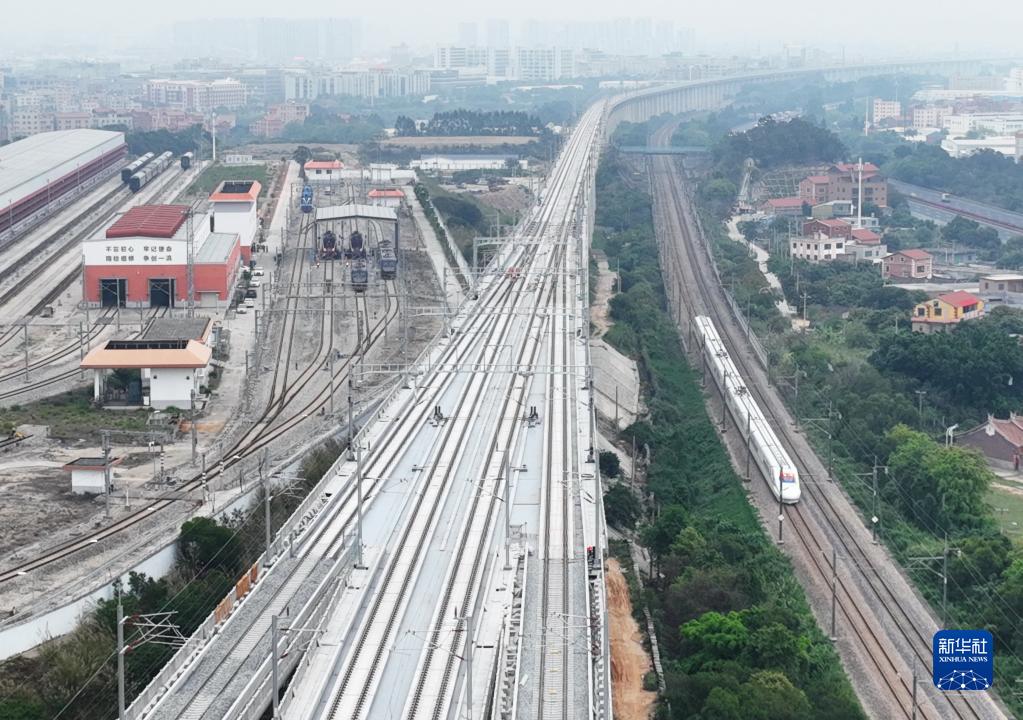 新建福廈鐵路廈門北進島聯絡線與杭深線(右)(4月12日攝,無人機照片)。