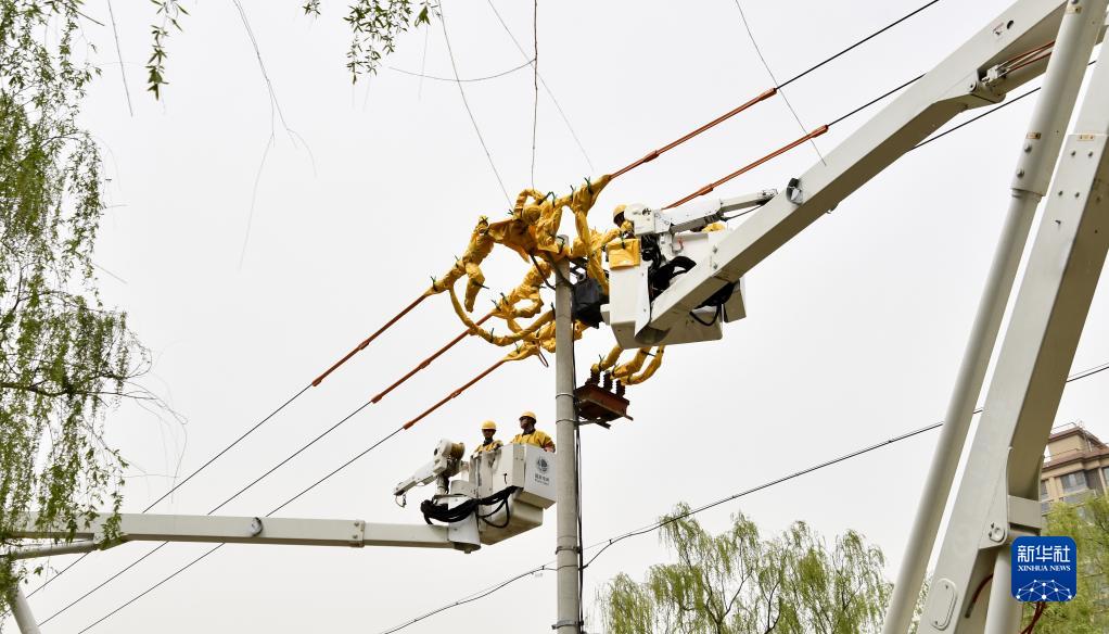 4月13日,工作人員在進行配電網帶電檢修工作。
