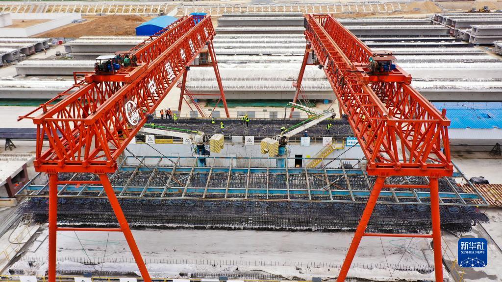 4月13日,在濟鄭高鐵中鐵十局濟南西制梁場,中鐵十局的工作人員在澆筑箱梁(無人機照片)。
