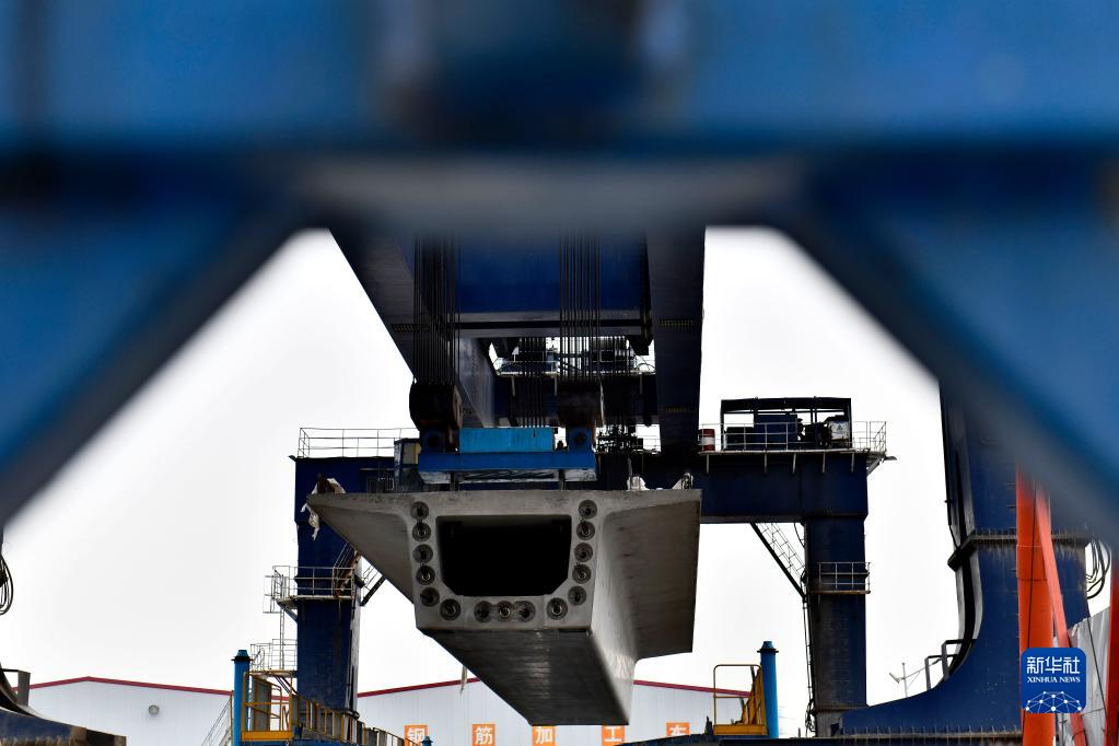 4月13日,在濟鄭高鐵中鐵十局濟南西制梁場,提梁機在轉運箱梁。