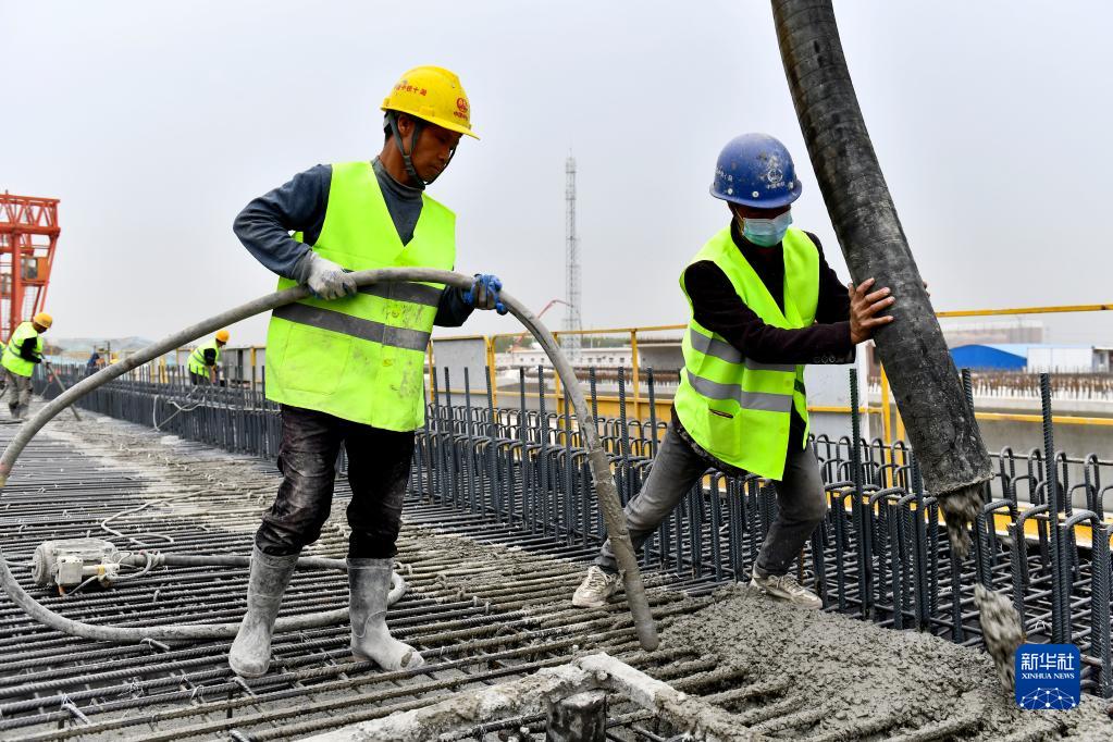 4月13日,在濟鄭高鐵中鐵十局濟南西制梁場,中鐵十局的工作人員在澆筑箱梁。