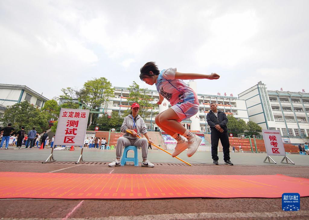 4月13日,在貴州省丹寨縣第三中學,考生參加立定跳遠項目測試。